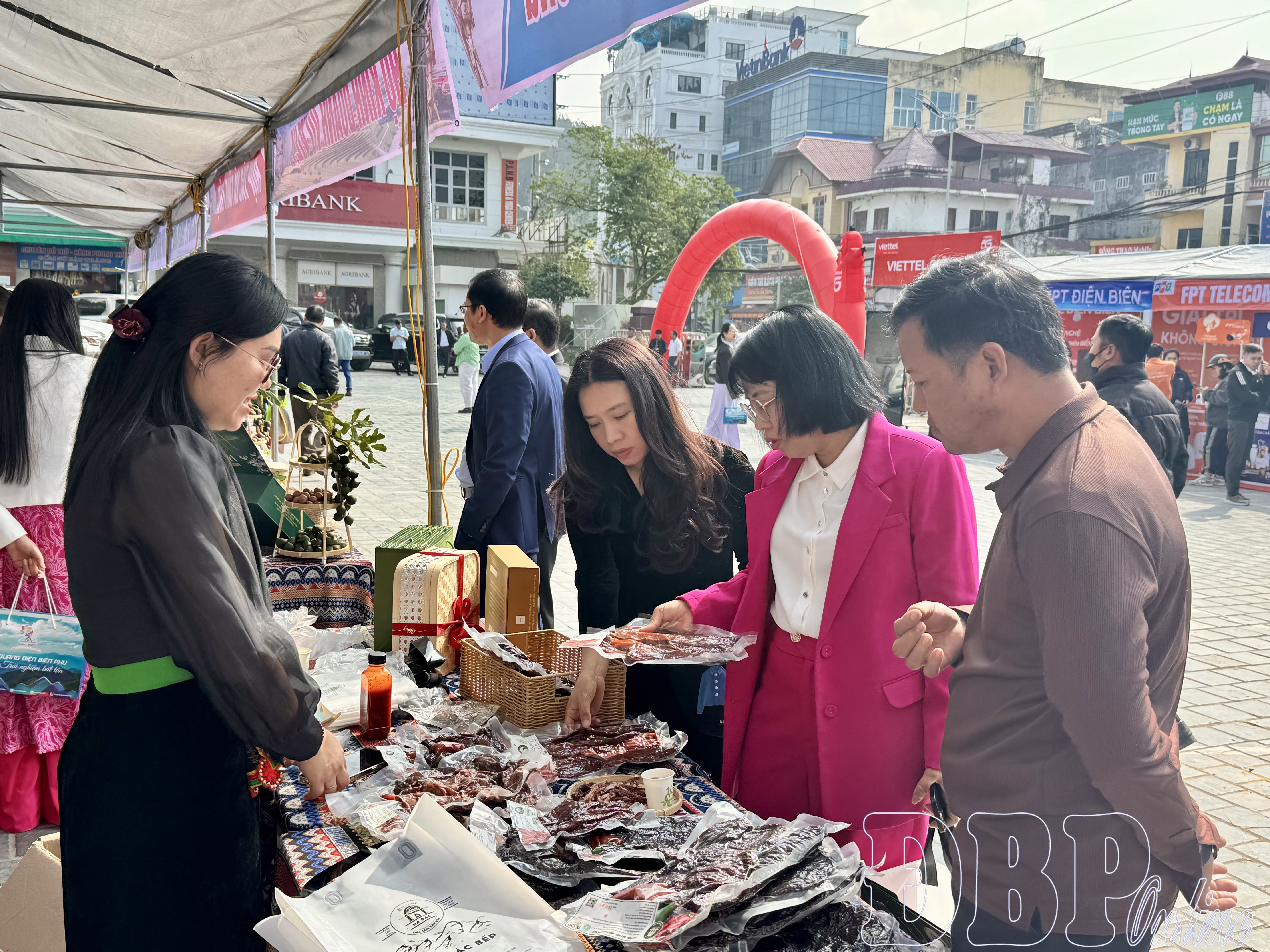 Người dân tham quan các gian hàng trưng bày của hộ kinh doanh Bếp nương Hà Bạc, xã Tuần Giáo trong khuôn khổ Hội thảo.